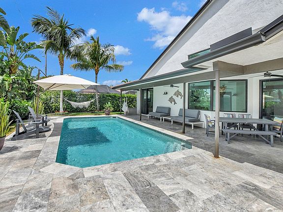 Impeccably renovated in 2020, this Paradise Palms home combines modern luxury with functionality. Herringbone wood-look tile flooring sets an elegant tone throughout. Chef's kitchen has sleek black cabinetry w/soft close cabinets, open shelving & large wine fridge. A highlight is the kitchen island w/white quartz countertops, perfect for meal prep &casual dining. Frigidaire Professional appliances, including a cooktop & double oven, add to the appeal. Primary bedroom offers a serene view of the pool through sliding glass doors, w/a spa-like on suite bath featuring a standalone tub. Den provides flexibility as a home office or 4th bedroom, w/sliding barn doors and a built-in Murphy bed. Enjoy the saltwater, heated pool and summer kitchen. Impact glass, fireplace ,AC garage& boat storage All of the bells and whistles of a new home!