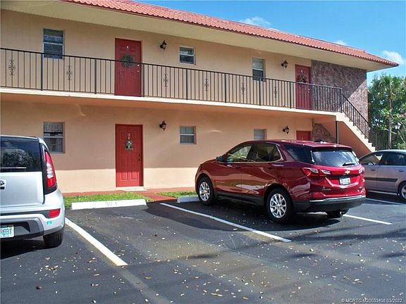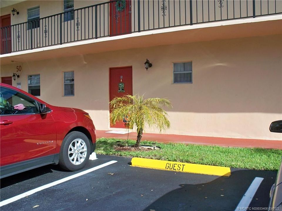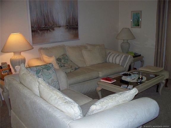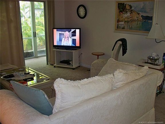 This is a first floor condo on the West side of Palm City Road close to the St Lucie River and 2nd clubhouse. Large bedroom with walk-in closet and adjoining full bath and 1/2 bath. Screened entry door. Carpet in living room / dining area/ bedroom. Back porch is screened and enclosed. Storage closet. The unit is being sold furnished with the exclusion of the tenants items. There is gate across the street to access the rest of the community. UNLIMITED GOLF is included plus water/sewer/basic cable and use of the amenities and 2 clubhouses. WIFI at the main clubhouse. No pets No trucks