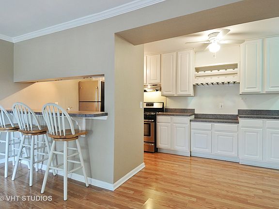 Great home or rental income. Lovely 3rd floor 1 bedroom, 1 bath condo in secured building overlooking pond & trees. Minutes to outlet mall, train station and I88, a commuters dream. Nice kitchen, plenty of cabinet storage and counter space, white cabinets, breakfast bar for additional seating, desk area, wine rack, space for smaller table, stainless steel appliances stay including dishwasher, built in microwave, refrigerator, gas stove. Spacious master bedroom has walk in closet plus 2nd closet. Bathroom with ceramic tile floor, tub/shower combination. Good size family room could fit L shaped couch, open to kitchen and sliding door opens to balcony. Enjoy relaxing on your private balcony with treehouse views, room for a grill. Coin operated laundry on site and in building. Parking is easy with the assigned parking space. 6/2020 balcony re-stained, carpets cleaned, professionally cleaned. Heat, water & garbage included in association fees. Short walk to parks and trails. Quick close. Move in ready.