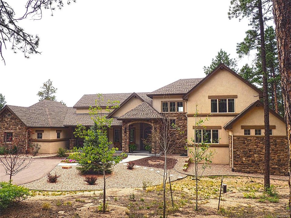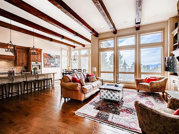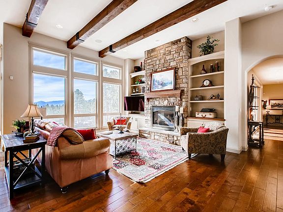 This magnificent property next to Fox Run Park features outstanding mountain views, is situated on 5.02 wooded acres with rolling hills, and is zoned for horses. The location is private yet minutes from everything you need. This 6 bedroom, 5 bath home was professionally designed w/ the finest quality finishes inside out and provides both elegance and comfort with its functional floor plan. Great room features beamed ceilings, floor to ceiling stone fireplace w/ custom built-ins and a wall of windows to bring in the views. The gourmet kitchen boasts beautiful slab granite counters, a center island with tons of seating, double ovens and a gas cooktop. The dining room has magnificent views. The main level master retreat features a tray ceiling with lighting and a luxurious spa with a spacious walk-in closet. Completing the main level is an office, a music room, a laundry room and a powder room.
