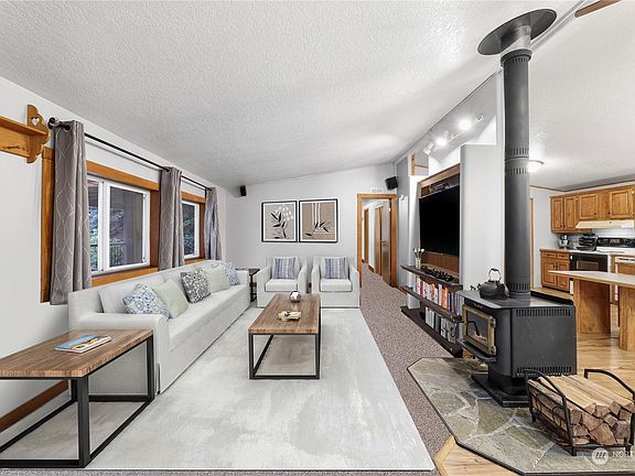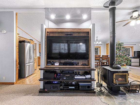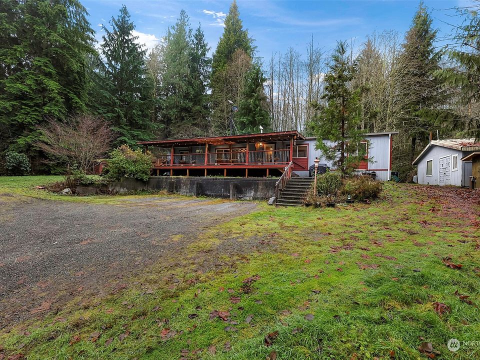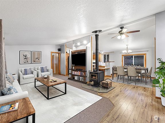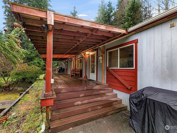 Experience the tranquil creek sounds & mountain views from your front porch in this private & serene residence on 5+ acres. Enter into the open & airy living room w/high ceilings & a wood-burning stove from the expansive front deck. This home is open w/a spacious floorplan that connects the cozy kitchen to the dining, living & family rooms. Generous sized bedrooms & a full bath. The primary bedroom, complete with en-suite bath & large closet, is situated on the opposite side of the house. Sizable utility/mud room & pantry- tons of storage! Fruit trees & room for gardening on this spacious, private & wooded lot. Ample Boat & RV Parking. Don’t miss the opportunity to own this charming home.