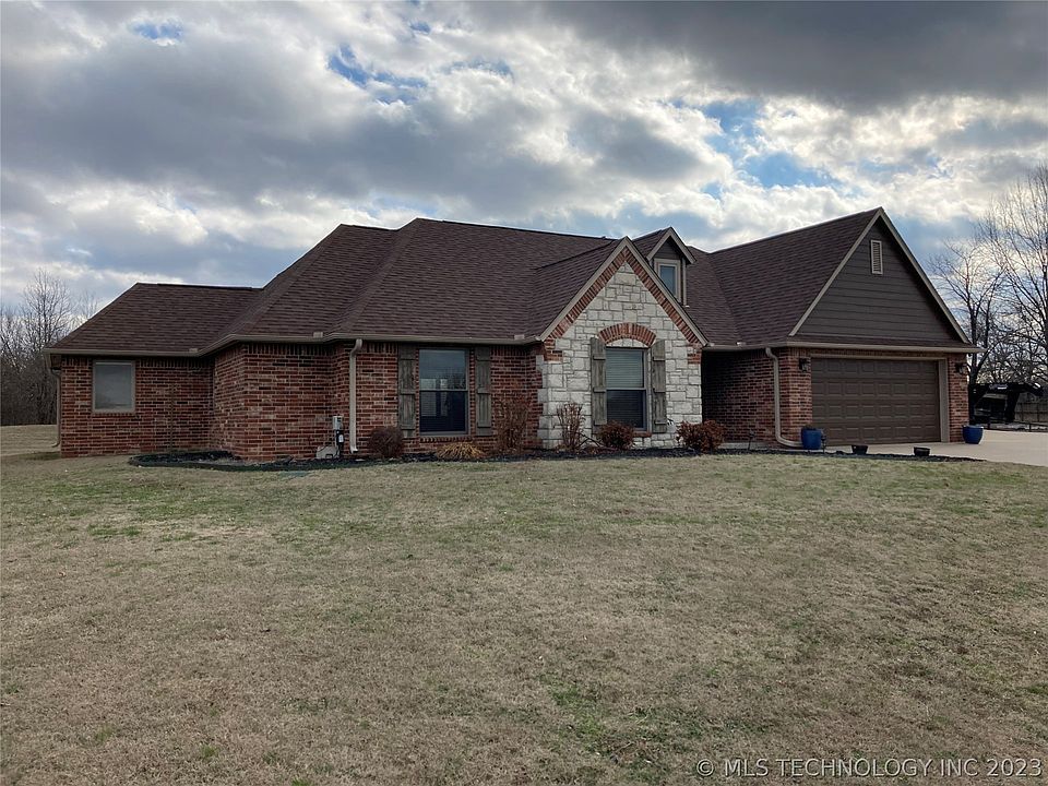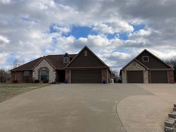 This special place has it all, 2 acres by the golf course & convenient, at the edge of town location. Extremely well built home with Pella exterior doors & windows, 6 panel wood interior doors, large living with cathedral ceilings and beautifully trimmed out with extra wide wood moldings & details throughout. Cathedral ceiling in large 2nd bedroom now used as office with more beautiful wood work. The primary bedroom has lots of space, giant walk in closet, beautiful pan ceilings with spacious full bath, double sink vanity, whirlpool tub and shower. Brick, wood, stone & granite decorate this home iniside & out. Almost new 50 year roof, new exterior & interior painting. Chef's kitchen with great features including Jennaire downdraft range, lots of counter space and under counter lighting. The 1,500 sq ft 2 story shop building was built in 2013. It is heated, finished out in drywall, great lighting & high quality cabinetry. Upstairs is another 600 sq ft of finished out space with water & sewer roughed in. Generac keeps the power on, automatic sprinklers keep the grass green, the full garage door screens keep the owners cool and the sunrises & sunsets are amazing from this hilltop home.