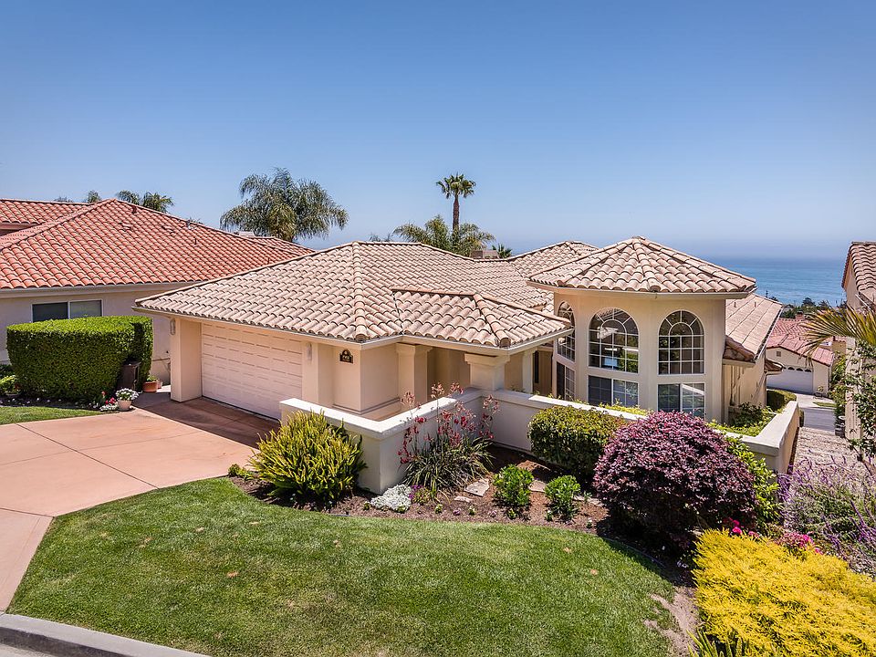 $75,000 price reduction! Best price/sf in the neighborhood! Overlooking the Pismo Beach coastline and boasting panoramic ocean views, this exquisite 2-level home is a Mediterranean gem. Located in the desirable Spyglass Ridge Villas gated community, this exquisite property offers 4 bedrooms, 3.5 bathrooms, two balconies, office, formal and informal dining areas, raised kitchen with pantry and a spacious great room with marble fireplace. Dive into coastal living from the two ocean-view balconies while you enjoy the 4th of July fireworks, migrating dolphins or whales or just unwinding after a long day of work. This custom home also features hardwood, tile and carpet floors, vaulted ceilings, spacious closets, custom white cabinetry, etched glass privacy windows, etched glass backsplash in kitchen, central vac, air conditioning, ceiling fans, intercom system with CD player, en suite bathrooms, numerous storage spaces, courtyard with fountain, 2-car garage, skylights and abundant natural light.