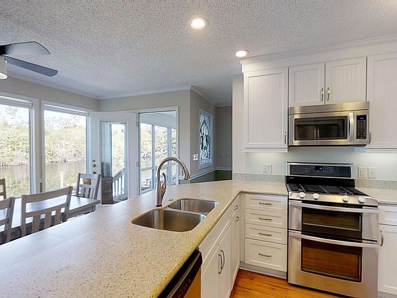 Primary or 2nd Home, Great Investment for vacation home on VRBO or AIRBNB. This magnificent Newly Updated 5 Bedroom, 2.5 Bathroom raised home w/Saltwater Pool is located on the widest part of the Waccamaw River & boasts amenities too many to list! **NO HOA***From the private, permanent floating dock to the boat ramp; refortified sea wall; saltwater pool (2016) , Carolina Room w/heating & cooling overlooking the river, Gas Stove/Double Oven & fireplace, a Residential Lift for groceries, & a detached garage/workshop, this is a true Southern beauty. The kitchen has a well-planned layout with the eating area overlooking the river, Merillat upgraded 42 inch cabinetry and solid surface countertops along with a Whirlpool french door refrigerator and gas/double oven stove, and a large 4'5 x 7 walk-in pantry. Chair railing & crown molding; solid oak flooring downstairs; NEW hardwood flooring upstairs (2016) in all 4 of the bedrooms, 2 HVAC Units installed in 2016, New Metal Roof, and a propane fireplace in the living area with new tile accents and a Carolina Room for enjoying the beautiful views in all directions give more than enough room for entertaining. There is a spacious 23 x15 Master Bedroom with hardwood flooring & cozy sitting area on the Main Level; The Sleek Master Bath was Completely REMODELED in 2018 w/ separate designer tub & shower w/seamless shower doors & pebble rock floor; double sinks; designer lighting & fixtures and a large walk-in closet w/shelving. This layout is ideal for the homeowner wanting privacy from guests or family - 4 bedrooms upstairs could also be used as office space, workout room, theater room, den, or just storage. There is more than enough storage in this home. 3 of the BDS upstairs have 2 closets each. On the first level of the home, there is storage space, an additional refrigerator/freezer, and even a toilet conveniently located to the pool. Spacious Mud room with large sink, clothes drying area and lots of storage; fold up ironing b