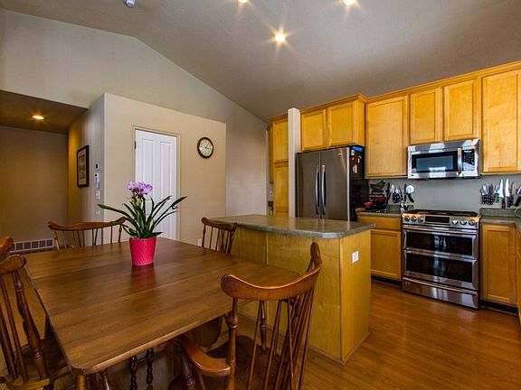 Upgraded stainless steel appliances highlight the maple cabinets in this spacious kitchen - great room. A separate formal living room/front room with vaulted ceilings, and a fully landscaped backyard escape with fantastic mountain views for entertaining. Outstanding neighborhood with 2 parks, public trans and freeway access. Huge garage with extra 3 feet deep. Extra touches: surround sound, wired for exterior Christmas lights, man door to garage, outdoor flood lights and extra storage. High quality $3000 Samsung gas range with dual door electric oven for the serious cook. Large craft room to die or convert to media room or additional bedroom space. Easy care stained concrete floors. RV pad. downstairs Storage racks are negotiable. 500+ perennials in flower beds.