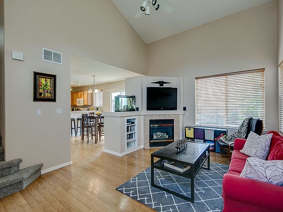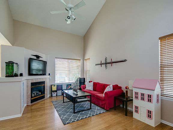 Freshly-painted home has great layout with just the right amount of living space for single buyer, couple or small family. Entire main floor has beautiful bamboo wood floors, and entire upper level has soft new carpet. Family room sits under vaulted ceiling with fan, bright with light from windows on three sides. Gas fireplace is nestled in the corner, with an adjacent built-in that’s perfect for stacking electronics and media. Dining area has an upgraded light fixture and gets tons of morning light. Kitchen opens to dining area, and includes appliances with gas range, stylish light fixture, and convenient breakfast bar that seats three. All bedrooms have ceiling fans. New paint in master bedroom and full bath. Washer & dryer included. Sunny fenced backyard has flowering trees and bushes, and a patio that gets afternoon shade. There’s room to grill, and a built-in sprinkler system. Set up kids’ fort in tree shade, or garden in the sun. Minutes to bike path, park or highway.