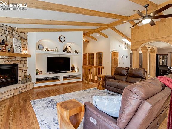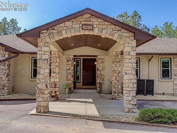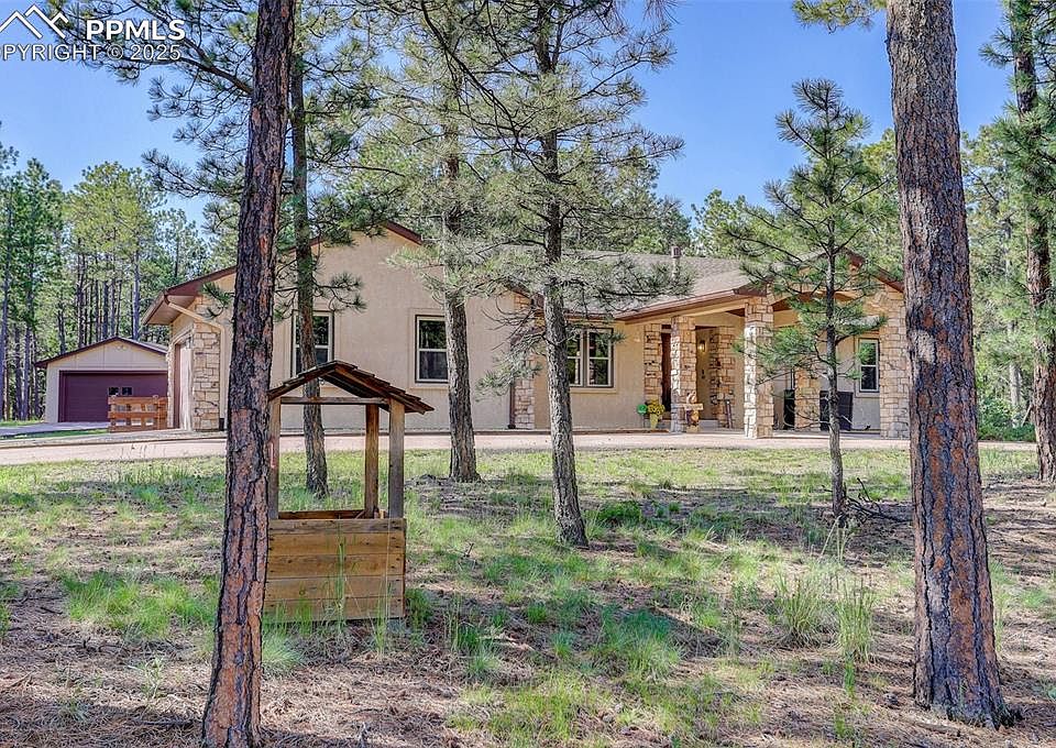 ASSUMABLE LOAN READY, This beautiful Colorado Retreat is nestled an a beautiful mature treed, 5.44 acre lot. Animals ARE allowed. Now is your chance to live in the Unbelievable BLACK FOREST and allowed to have horses, Dogs, Chickens, ect. This custom High end finished home is move in ready with solid wood floors, doors and trim. The kitchen boasts of Granite, double ovens, Breakfast Island and an eat in area with bay windows. The Great room is framed from the ceiling with solid wood beams, stone wall fireplace and the room glows of natural light from the wall of open windows. Snuggle in on a cold winter day in front of your natural gas fireplace or sit out on your covered deck around the fire pit and watch the snow fall. In the summer enjoy your favorite cup of coffee and listen to the birds sing and the tree branches sway in the breeze while the kids enjoy the play ground and private ZIP line. As the day comes to a close, Retire to your beamed ceiling Primary retreat with walk in closet and 5 piece spa like bath with jetted tub. The secondary bedroom on the main level is great with a murphy bed and or office. There are 2 more good sized bedrooms downstairs along with a 3/4 bath, exercise room, Huge open family room and storage area in the walk out basement. The Family room has a great wall for a big screen TV. There is also an area for a library and an area for a game table. Tucked behind the wall is a spacious storage/craft area. There plenty of privacy and room for everyone. The Detached garage is heated with work space and great storage for all those fun bikes, kayaks, and other toys. The concrete circular driveway allows 20 cars plus during your hosted BBQ party. Life here has endless possibilities from tranquility to nature walks, zip line, all sorts of animals, 4 H projects, Scout camp outs to that massive reunion. And to add to this, there is a pad already marked out and soil test done for the allowed secondary GUEST house. Come experience the Wonder.