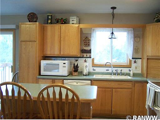 Wonderful split level home in a quiet neighborhood on the east edge of Rice Lake. This 4 bedroom, 2 bath has been well maintained and is situated on a double lot. This home features open concept living, dining, and kitchen area with a high cathedral ceiling. There are wood floors throughout this area and kitchen has oak cabinets and an island with bar stools. The bedrooms are spacious with plenty of closet space. There is a full bath,with double sinks, on each level.