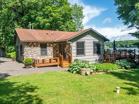 Recently updated lake home that sits on a large lot with many mature trees. Approximately 175' of lake frontage. Additional 1.1 acre lot across the road available to purchase separately. Many upgrades including new kitchen cabinets, new bathroom upgrades, tile, flooring, stone on the exterior and more. Most furnishings included and the dock. Knotty pine throughout, asphalt driveway, nice 4 season porch. Excellent fishing and recreational lake all within a short distance of the Twin Cities.