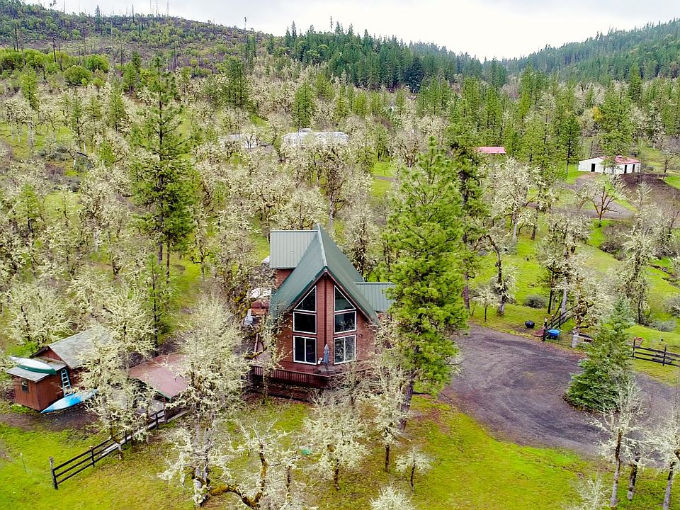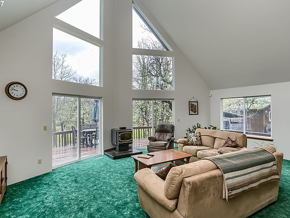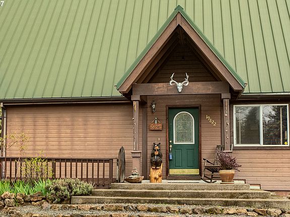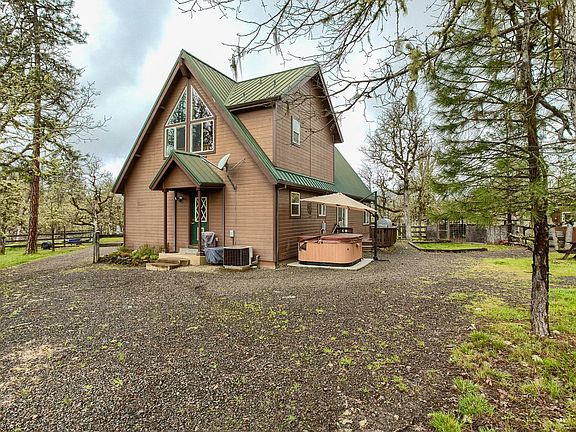 The perfect rural retreat on just over 5 acres! Charming chalet style home has soaring vaulted ceilings with large picture windows. Kitchen and dining open to great room. Kitchen offers raised eating bar, new stainless steel appliances including smooth cook-top range/oven, open cabinets and large pantry closet. Vaulted master suite on upper level and has walk-in closet and newer hardwood flooring.