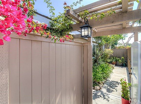 This charming, single level home sits on a corner lot in the tranquil Beachwalk community just half a mile from the sand with a wonderful floor plan and perfect ocean breezes. Vaulted ceilings and skylights are found throughout the living space, along with volume windows allowing for a flood of natural light to fill the home, creating a calming and serene ambiance. The private, gated walkway leads to to the front door, opening into the spacious living room with a fireplace and and dual-pane sliding door access to the south-facing backyard patio with its own lemon tree. The country style kitchen offers recessed lighting and a tray ceiling, immaculate white tiles with a tile backsplash, along with plenty of counter space and cabinets for storage, and the full hallway bathroom comes equipped with a shower and tub, and a skylight. The second guest bedroom off the hallway has vaulted ceilings and shares access to the charming interior patio with the ensuite master bedroom, which offers its own attached bathroom. This community is one of the most desirable in all of Huntington Beach, with your own volleyball sand court, five pools, saunas, clubhouses, and absolutely beautiful walking trails and greenbelts to enjoy a sunset stroll. Sitting just half a mile from the sand and located near excellent downtown restaurants and shopping, this lovely home is ready for you.