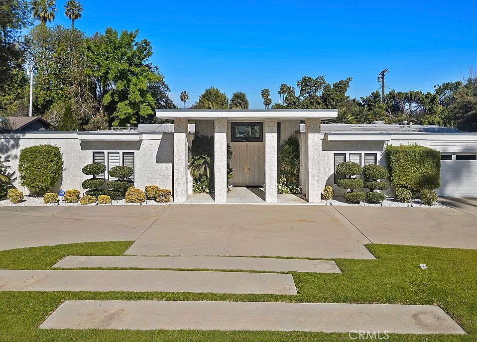 This single-story midcentury modern residence offers approximately 4,400 square feet of living space on an expansive .38-acre cul-de-sac lot, ideally located south of Ventura Boulevard in Woodland Hills.