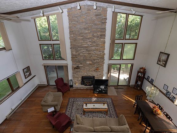 Beautiful 20' tall wood burning stone fireplace centers your view of the lake from the huge (600+ Sq Ft) living room with soaring ceilings and attractive pegged oak hardwood floors. 1st tier location with nice lake views and good proximity to fishing, parks, tennis courts, bocce courts and the pool. 15 x 12 adjoining kitchen with oversized walk in pantry and adjoining breakfast nook. 1st floor laundry. Large 1st floor bedroom. Family room adjacent to 2.5 car double doored garage and screened in porch. Loft area ideal for office overlooks the living room. 2nd floor master with 1/2 bath and walk in closet. Gas forced air furnace (Nest Thermostat) with auxillary baseboard heat. New roof in 2020. All furnishings and appliances included at no charge. Any furnishings not wanted by purchaser will be removed.