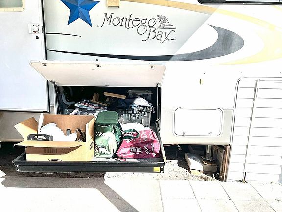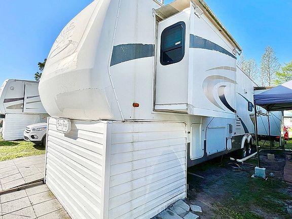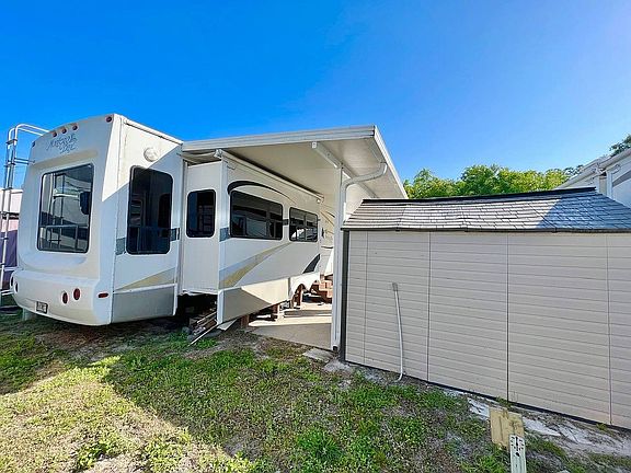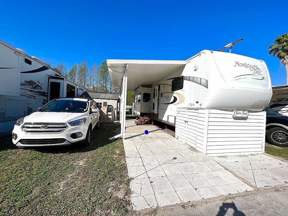 And you can live your DREAMS right here and now in this TURN KEY home. There is nothing that you will need to move right in. Just bring your suitcase and flip flops. Cause you're going to be spending your days and nights sitting by the pool. Just relaxing and enjoying every minute knowing you are finally right at home. With this well-kept, beautifully updated 5th Wheel, RV. You will be pleasantly surprised when you see the floors that have been updated to laminate flooring. To give the look and feel of a home. The kitchen is fully stocked with plates dishes, silverware, cooking utensils, pots, pans, a toaster oven, coffee pot, even wine glasses. The bedroom has sheets, pillow cases