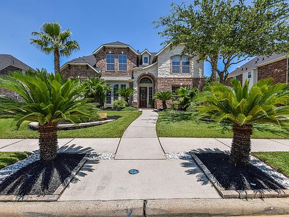 Fabulous Trendmaker home with impressive stacked stone elevation, gorgeous palm trees, 2.5 car garage, elegant 2 story entry with wrought iron stairway railing, study with french doors, both dining with rope lighting and french door to kitchen, hardwoods, gas log fireplace, island kitchen with 4-burner gas range, stainless appliances, breakfast bar, tons of natural lighting, huge master bedroom with sitting area and gas log fireplace, master bath suite with dual shower heads, whirlpool tub, dual vanities, 2 master closet with built in organizers, 3 spacious beds up, gameroom could be media. Recent roof and quiet garage door operator. Resort style back yard with pool, spa, water features and in ground entertaining covered area/bar, cobble stone decking and no back neighbors ! GLF offers many amenities including tennis courts, lakes, boat house, dog park, equestrian center, fitness center, athletic complex, multiple playgrounds & 27 hole Gleannloch Pines golf course