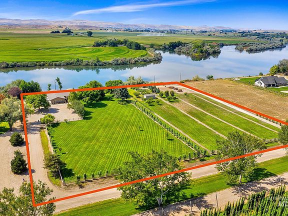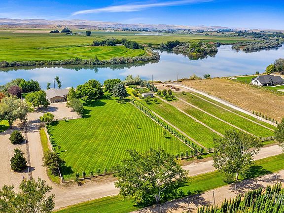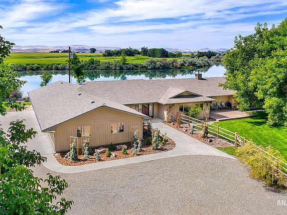 LOOK NO FURTHER! Come and view this rare single story private WATERFRONT country estate offering breathtaking views of the SNAKE RIVER and the Owyhee Mountains! Property boasts 5+/- acres of manicured landscape, full coral fencing, private driveway, riverfront patio, multiple areas for outdoor entertaining, full irrigation, fruit trees and a lovely garden. Once inside this 4100 sq ft home, you will be greeted with lovely open entry, spacious living & family rooms with river views, 4-5 bedrooms (one bdrm possible second master suite), 3 full bathrooms and excellent craftsmanship throughout. Gourmet kitchen features custom cabinetry, tasteful granite counters, stainless appliances, cooking island with views of the beautiful yard and river. Launch your boat on the private dock & launch ramp exclusive to the community. Overall, the property offers a comfortable living experience in a stunning natural setting.