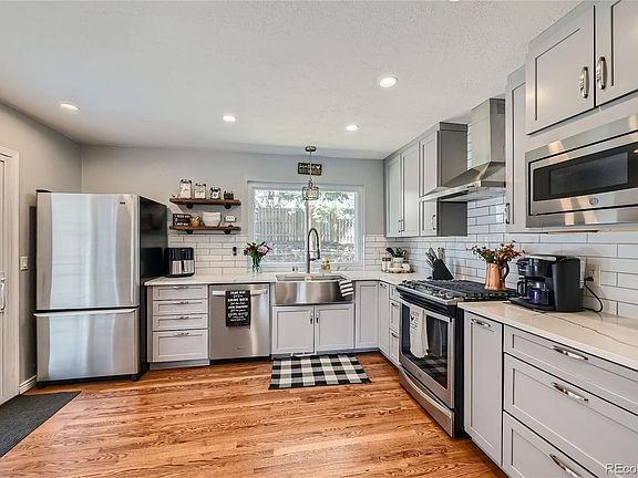 Welcome to your beautiful new home in Aurora Highlands! This impeccably maintained 5-bedroom, 4-bathroom cul-de-sac home has a wealth of amazing upgrades & recent renovations. Nearly everything in this home is new! It is a true gem & will not last long! Discover a newly renovated gourmet kitchen equipped with brand new appliances, a sleek gas burning stove/hood, new cabinets,, stunning quartz countertops, & stylish subway tile backsplash adds a touch of modern elegance, creating a space you will fall in love with while cooking. The main level features real wood floors, newer carpet, chic shiplap built-ins & barn door accents. Recently painted, every corner exudes a fresh, inviting ambiance. All bathrooms in the home have been newly updated, each offering a serene retreat for relaxation & rejuvenation. With new windows on the main level & 2 Pella sliding doors boasting a lifetime warranty, natural light floods the home, enhancing its airy, welcoming atmosphere. The large family room in the basement is a perfect escape for a family movie night or potentially a game room. Outside, the allure of this lovely home continues with a brand new concrete driveway, new concrete walkways, & two new spacious concrete patios in the backyard, perfect for al fresco dining and entertaining. The meticulously landscaped front & back yards feature mature trees, a shed for extra storage, an area for your very own vegetable garden, and a chicken coop. Plus, with a new retaining wall & Cat4 hail resistant roof, your home is not just beautiful, but also built to withstand the elements. This home is perfectly situated with easy access and just minutes to Downtown, DTC, Buckley, the Anschutz Medical Campus, plenty of shopping and restaurants within walking distance. Don't miss the chance to make this wonderful home your own! *Offering a 1-Year Home Warranty* https://www.virtuance.com/listing/1984-s-pitkin-st-aurora-colorado