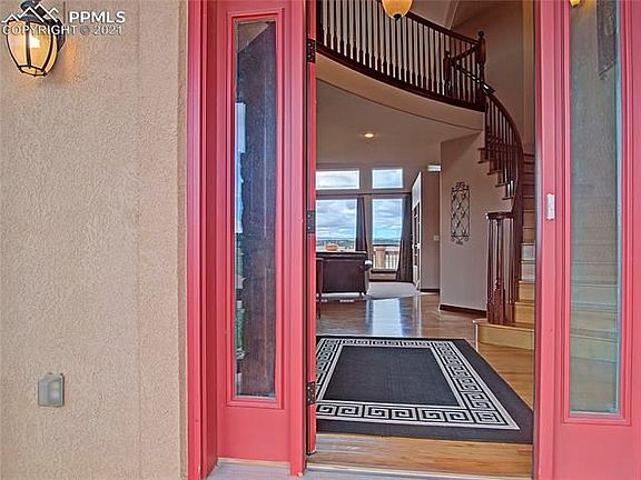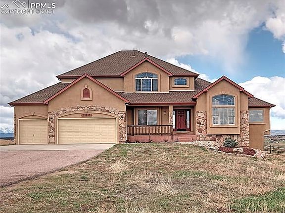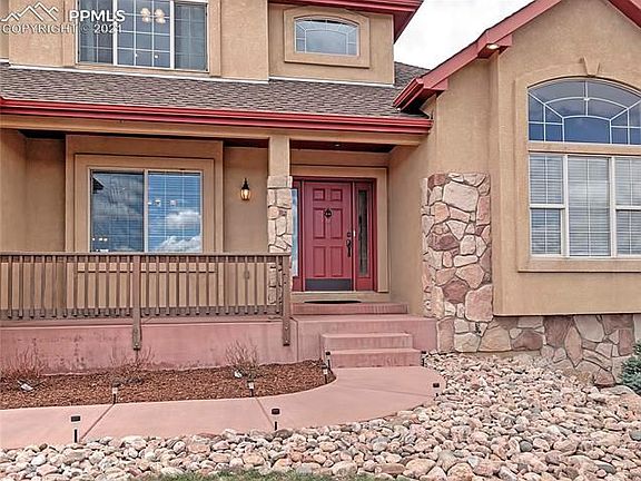 Located on 5.02 acres this custom two-story stone stucco/stone home is close to the amenities yet feels like the country. Spectacular Pikes Peak views can be seen from the back of this home from the kitchen and great room. The main level master bedroom makes this home special with three bedrooms located upstairs and two more in the basement to fit a variety of needs. The main level private office is great for working from home. Great room has a wall of windows, a soaring ceiling, and one of three gas fireplaces. Gourmet kitchen has alder cabinetry, granite leather finish countertops, two islands, 66-stainless steel appliances, and a spacious eating nook. Main level laundry comes with a washer & dryer, closet and storage cabinets and utility sink. Head up the curved wood staircase to find three bedrooms, two full bathrooms, and a 12X9 loft space perfect for those e-learning days. The lower level walkout basement is built for fun with a huge rec room, 3rd gas fireplace, an exercise/storage room, and plenty of room for game tables. The mechanical room is also spacious with room for shelving & two hot water heaters. This home could easily accommodate a family member in the basement needing care. With plenty of storage closets inside the home, there are built-in shelves in the 3 car garage and removable shelving in the mechanical room as well! Easy access to Colorado Springs, Monument, and Denver. Wifi is excellent, D38 schools, and close to amenities.