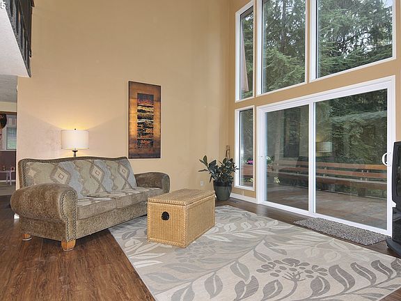 This custom home sits on near 5 beautiful & private acres & offers an open floor plan, living room w/ wall of windows overlooking the trees, huge upper family room w/ fireplace, large bedrooms, New tear off roof & newer septic, heat pump, appliances & more. Great for entertaining! One-of-a-kind property w/ huge deck overlooking old growth trees, private creek, a 40X29 shop, & RV hookup. Away from it all yet only 1.5 miles from town!!