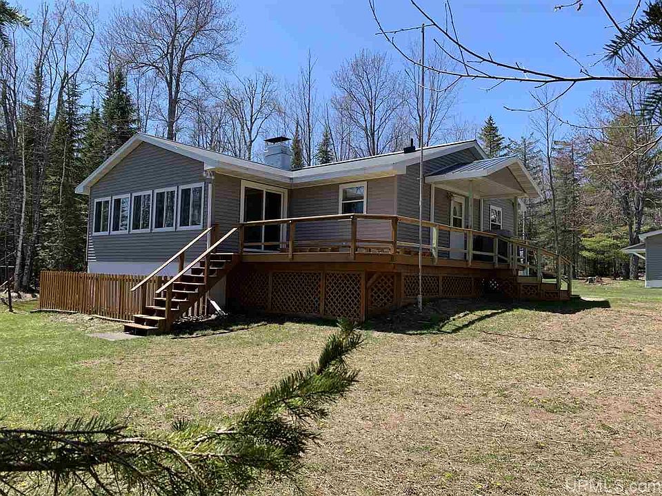 On crystal clear Lake Superior is Huron Bay! Known for its excellent fishing opportunities! This home has been nearly completely redone! The kitchen is gorgeous with quartz counter tops, hickory cabinets with soft close cabinets and drawers, ceramic tile and glass backsplash and a Jenn air stove with indoor grill! The counter facing the kitchen area seats three and is genuinely nice for visiting! There is oak flooring through the kitchen, living room and dining area. There is a gorgeous brick fireplace and windows across the entire front of the home. The living room area was done in ash handcrafted tongue and groove paneling and really adds to the overall comfortable feel of this home. I just really love the open space here and the view of the water! The deck located just outside the dining area also is a great place to take in the water and quiet of it all. You'll find handcrafted tongue and groove yellow birch in the master bedroom with a half bath. There's a full basement with a workspace area, washer/dryer, wood storage room and access to outside. The yard is nice! 243' along the shore gives a lot of privacy, there's power and a pump to run water! Detached 2-car garage is plenty big for the boat, which by the way, can be included in your purchase. There's a turn-key property here with furnishings that can be included! The portable dock that comes with the property, is good and solid and can withstand even the best of Lake Superior! For year round living on the lake or just a summer home, this is the best! It is tastefully done for the northern woods on Lake Superior!