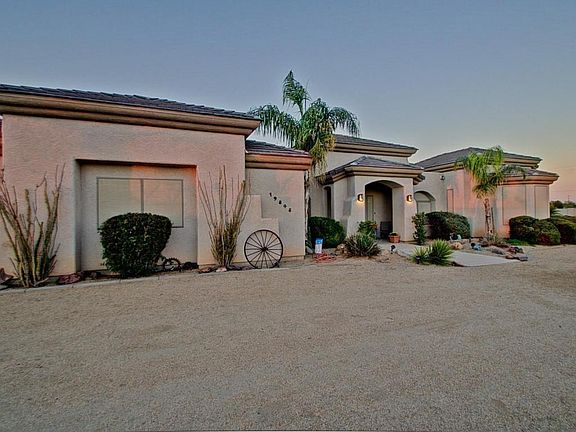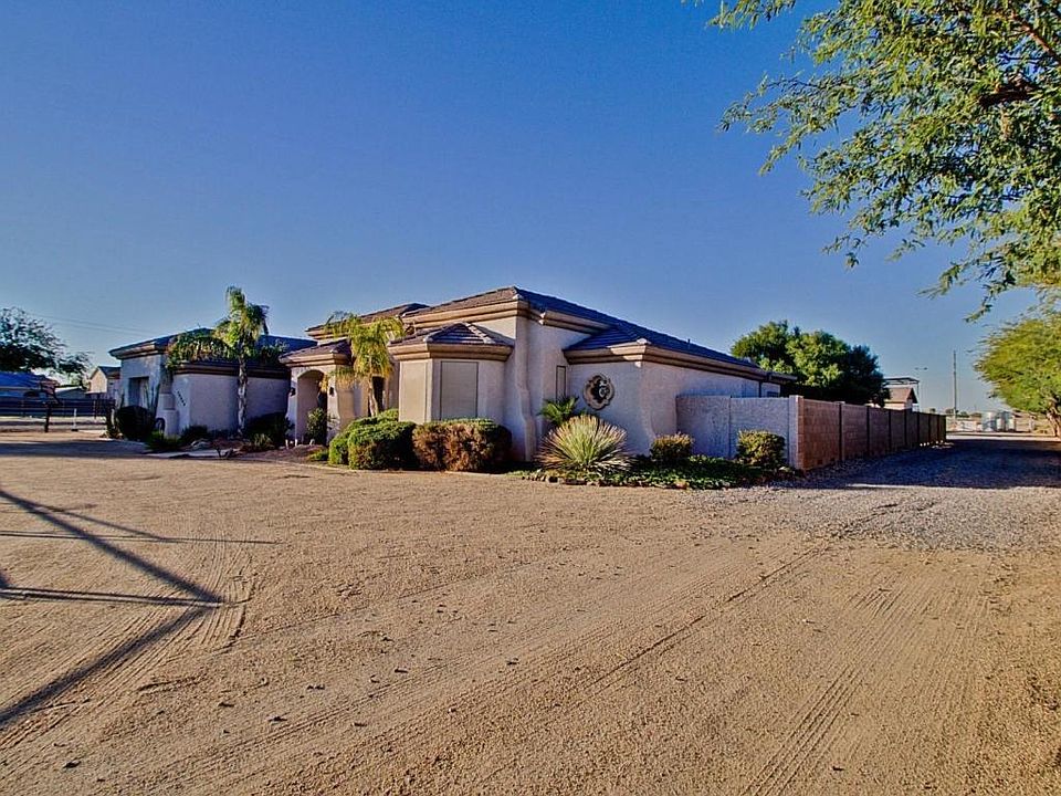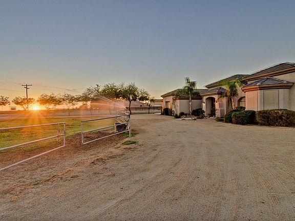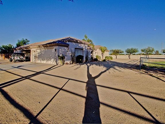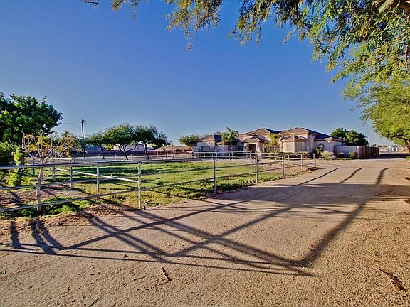 Gorgeous home on Huge 4.88 acre irrigated lot complete with full horse setup. 800 sqft office with tack room that could be converted to a guest houseconnected to huge barn with plenty of stalls for your horses. Lighted roping and riding arena, fenced pastures and even a lighted pen in the front yard complete this horse lovers dream. Home has a great open floor plan with soaring ceilings, plantation shutters, and large picture windows. Large great room has plush neutral carpet with a cozy brick fireplace, backyard views, and wet bar. Upgraded kitchen has center island with electric cook top, separate breakfast bar for extra seating with stone countertops, natural wood cabinets, & black/stainless steel appliances. Beautiful master suite with spacious seating nook & picture windows.