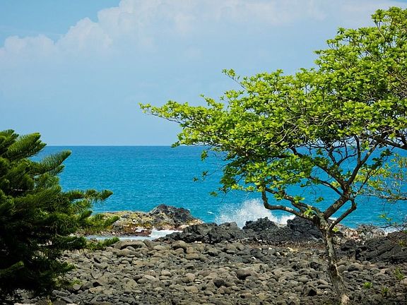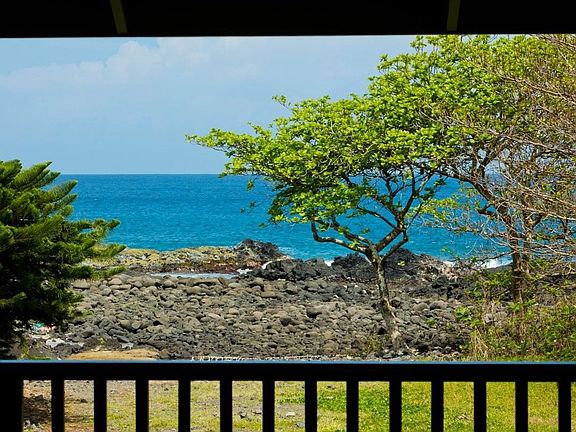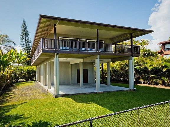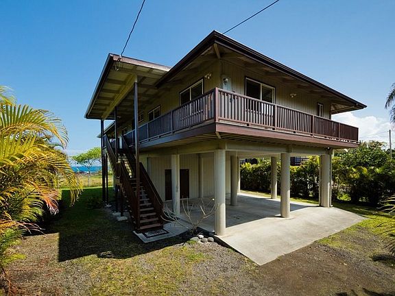 Desirable Keaukaha, a hidden jewel in East Hawaii. Fabulous views from this well thought out, immaculately maintained home. Property has many upgrades. It has insulation in the walls and ceiling, not only does this create some sound proofing from the street noise, but it also makes the home cooler on those hot days. The range, washer and dryer, and the dishwasher are newer. Water heating is provided by solar, so electricity bills are reduced. The property is completely fenced, with palms and landscaping creating a fabulous privacy barrier. The wrap around deck is made from a composite deck material, definitely a bonus this close to the ocean. There are even privacy screens you can pull down on the sides of the larger lanai on the ocean side. The exterior of the home was painted in the last two years, and the downstairs 364 sf storage room is fully permitted. Inside the home there are easy to maintain laminate floors. The large open floor plan of the living room opens up to the deck area where you could sit and watch the whales in the winter. Kitchen has a breakfast island; ceilings are vaulted. The home feels larger than its 1392 sf. There is an inside laundry room and the master bedroom has a large walk in closet, and an ensuite bathroom with double sinks. Lots of attention to detail, not to mention those stunning ocean views and great location make this a home to check out today.
