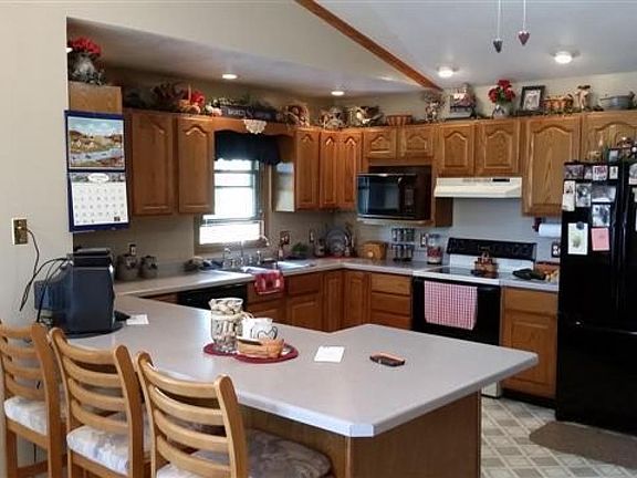 Kitchen has breakfast bar, oak cabinets, 4x6 walk in pantry and vaulted ceiling. Living room has brick fireplace, crown molding and vaulted ceiling. 6x6 main floor laundry. Master bedroom has slider door to private deck, walk in closet, private bath with jet tub and separate shower. Full finished walk out basement with wet bar, fourth bedroom or office and full bath. 16x28 deck off kitchen. Pool Table Nego. Furnace 2013.