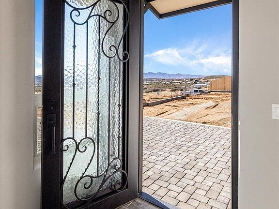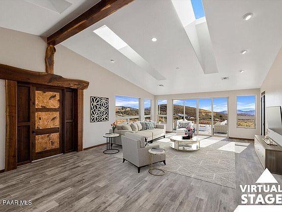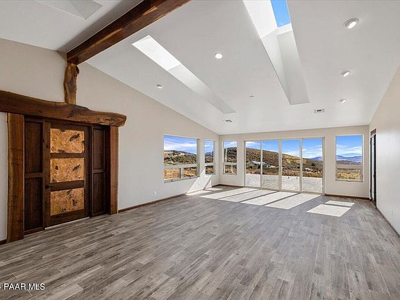 Nestled on 4.5 acres and set against the captivating landscape of the Prescott National Forest, this stunning new construction home is a true masterpiece offering sweeping panoramic views that envelop you with vistas stretching 270 degrees. Welcoming you in is a gorgeous wrought-iron front door with decorative rain-glass. Step inside the great room to discover plank wood-look tile flooring, soaring high-volume vaulted ceilings adorned with dramatic skylights and a 4-panel glass door infusing the space with natural light. Adding warmth and character, the walnut cabinetry, doors and trim show off the amazing custom woodwork in the home. In the kitchen, the craftsmanship continues, offering walnut cabinetry with soft-close features, stainless steel appliances and exquisite granite counters.