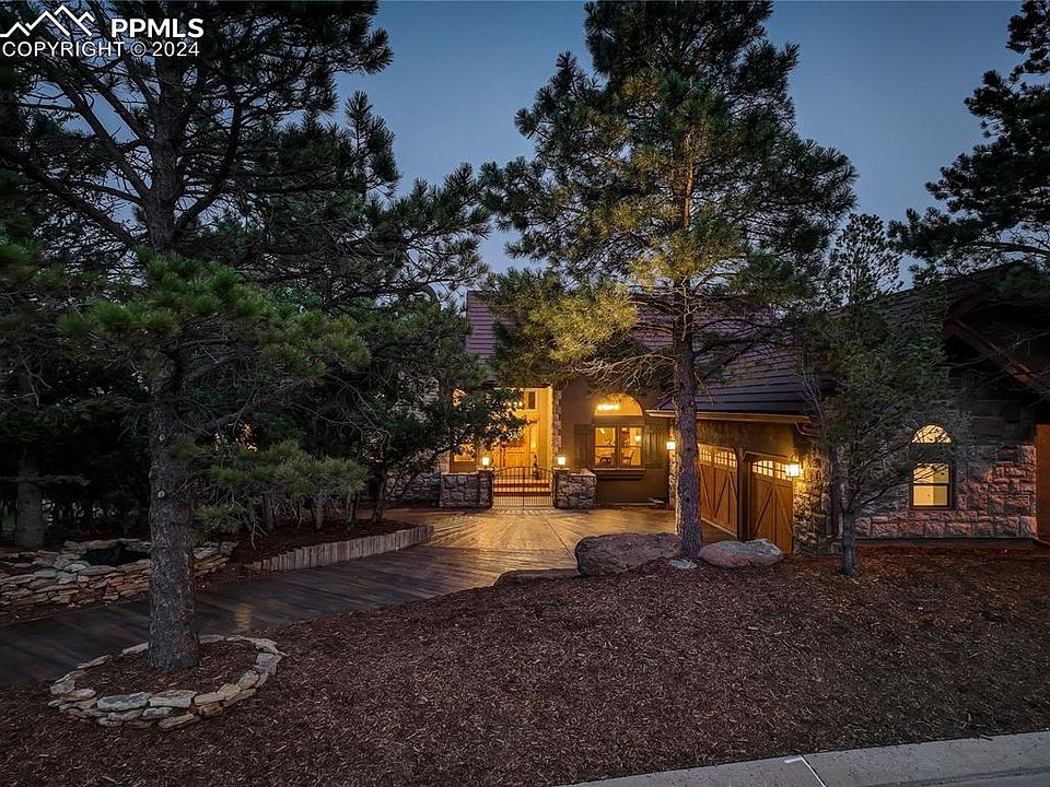 Stunning ranch style home in the peaceful natural setting of Hunters Point, with easy access to Blodgett Open Space & Ute Valley Park. A serene water feature, meticulous landscaping, and treated driveway create a perfect façade. Relax in the spacious living room with remote control blinds, a brick-surround fireplace, elegant stone flooring, and a walk-out with breathtaking mountain views. The updated kitchen is a chef's dream. Prepare a culinary masterpiece with a central island, stone countertops, stainless-steel appliances with dual ovens, and convenient garage access alongside a spacious pantry. Dining options include barstool seating at the counter peninsula, a charming breakfast nook, and a formal dining room with an elegantly curved ceiling, perfect for any occasion. An inviting sitting room comes with plush carpeting, a cozy fireplace, & built-in shelving. Across the hall is a den accented with crown molding, a closet with built-ins, and an attached 3/4 bath, presenting flexible living options. The primary suite is a true retreat with its own fireplace and built-ins, wood flooring, a large walk-out to a private deck, & an expansive walk-in closet. The magnificent 5-piece primary bath features a dual sink stone vanity, soaking tub, walk-in shower, a bidet, & sleek tile flooring. Picture windows bring in loads of natural light for the stairway to the lower level. The updated family room is perfect for entertaining, with a brick-surround fireplace, plantation shutters, and a walk-out. Each of the 3 bedrooms on this level comes with a walk-in closet featuring built-in storage. This level's guest bath is a finely appointed 3/4 bath with dual sink vanity & oversized walk-in shower. Ensuring ample space for all needs, the 3-car garage is oversized and includes built-in cabinets for storage. Just 10 minutes to I-25 & having been previously featured in the Parade of Homes, this residence offers luxurious living with a harmonious blend of elegance and ease.