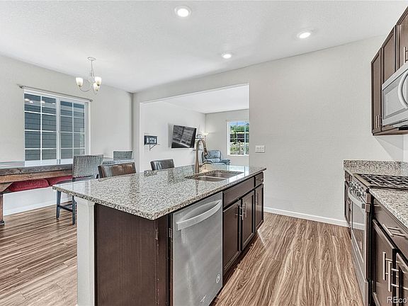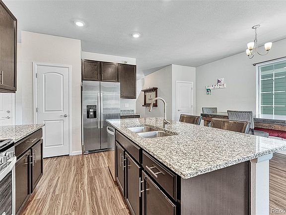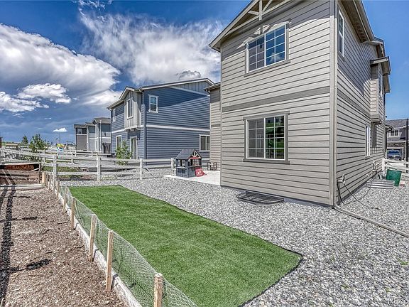 Newer built home with tasteful upgrades including slab granite counter tops, large kitchen island, stainless steel appliances, gas range, upgraded cabinets, upgraded wood laminate flooring, 9' ceilings, main floor office, and solar panels. Upper level has 4 bedrooms with matching ceiling fans in all bedrooms. Primary bedroom has a walk-in closet with a built-in turn style. No maintenance back yard is fully fenced with a stamped concrete patio. Other amenities include a covered front porch, brushed nickel hardware, radon mitigation system, & central A/C. HOA includes a pool, fitness center, and clubhouse. Attached racks in the garage and basement are included.