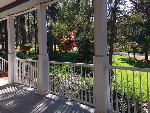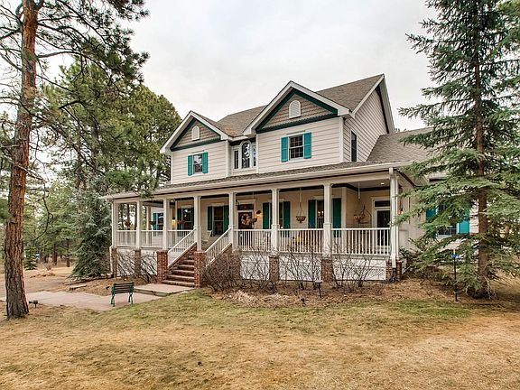 Stunning custom farmhouse in Elk Creek Ranches on over 5 acres zoned for horses. Enjoy Colorado evenings relaxing on the cozy 50' long front porch with wood ceiling, crown molding with front and kitchen entrances. Beautiful custom designs throughout including custom handmade Cherry doors, designer arched and leaded wood windows and built-in study nooks in bedrooms. Gourmet kitchen featuring stainless steel top-of-the-line appliances, double wall oven, center island with 5 burner gas range top, Cherry cabinets, new granite countertops, tile floor & eating area with walk-out to front porch. The formal dining room features chair railing & hardwood floors, perfect for large family dinners. Formal living area is off the front of home and the large great room w/ gas fireplace, custom wood mantel & tile surround, tray ceiling and double walk-outs to the two tiered deck. Main level master has sitting area, hardwood floors, private bath with steam shower, jetted tub & walk-in closet.