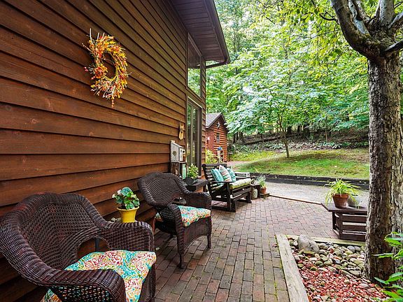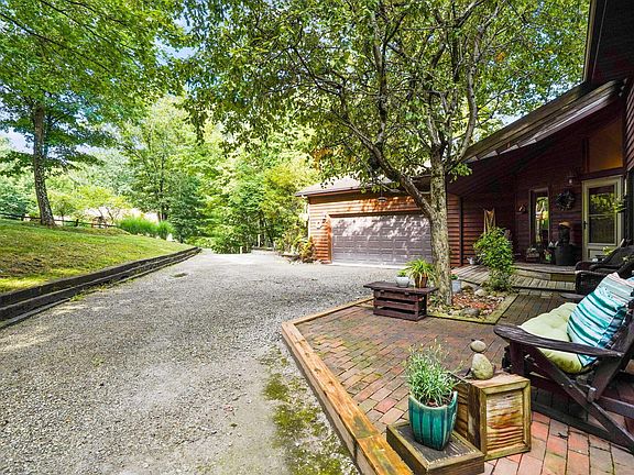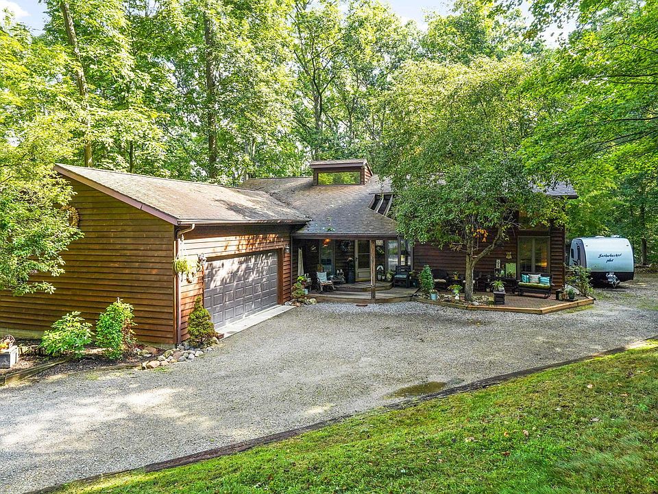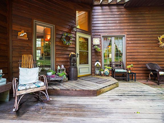 Walk into an open concept living space w/3'' Solid Oak floors, vaulted ceilings and skylights, Fireplace, Wraparound deck the length of backside of the home. Ample light throughout, cozy dining area. A beautiful Corian Kitchen Island w/ 42'' kitchen cabinets and a built in work station,1st floor laundry/mudroom off the garage and half bath. Owner's suite has spacious walk in closet, full bath w/jacuzzi tub, walkout deck to a lovely screened in Gazebo w/electric, 2 additional bedrooms w/ storage throughout. A fully finished walkout basement for extra space. Amish built storage shed and newer windows in some rooms.