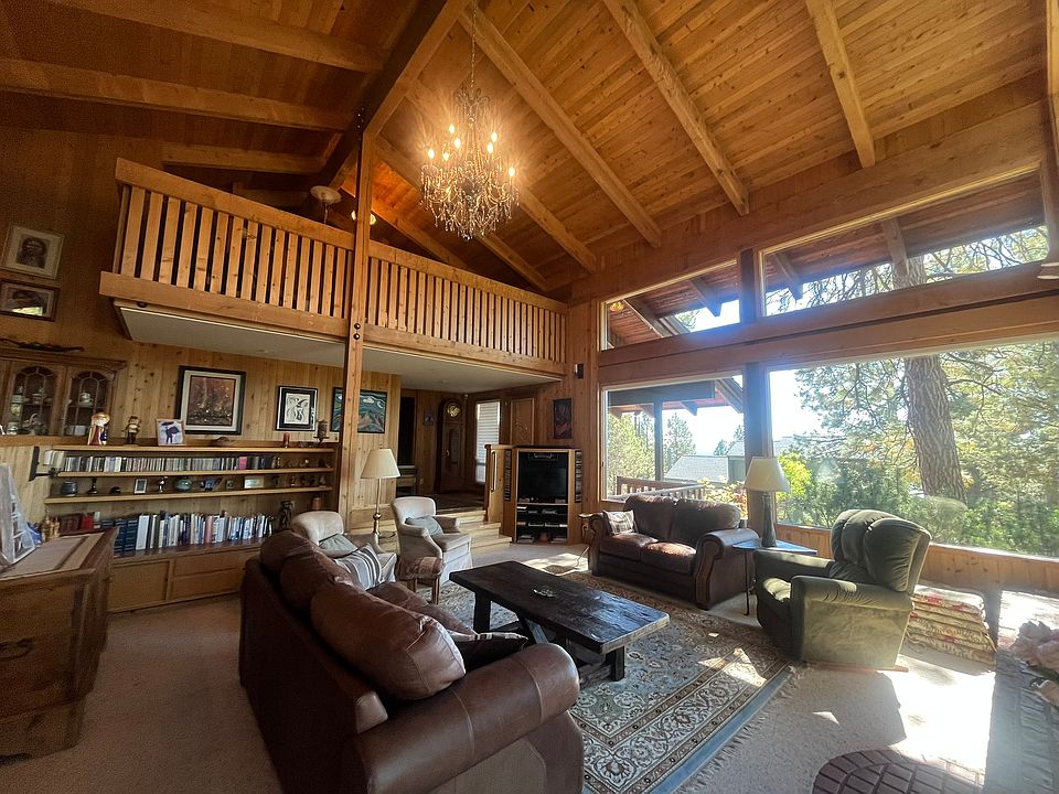 Beautiful, one-of-a-kind home on a rare corner lot with aspens, pine trees, and spectacular views of Mt. Bachelor. A Swiss chalet-like home built with remarkable wood beams from Bend's historic sawmill, high ceilings, crystal chandeliers, and large windows that showcase stunning views and gorgeous sunsets. This hard to beat location is situated in a lovely neighborhood and is not far from downtown Bend, hiking and biking trails, the COCC campus, and the world-class ski resort, Mount Bachelor. This 3,400 square foot home has an open floor plan with a large living room, kitchen, and dining room, and is great for entertaining. The loft that overlooks the living room has a collectors' pool table (that stays in the rental) and would be a good spot for an office with a view. Sip coffee on the sunny front porch and entertain friends and family on the west-facing deck. Soak in the hot tub on the deck off of the master bedroom. Central air will keep you cool in the summer, and the gas fireplace will be cozy and warm in the winter. You'll have plenty of space with 5 bedrooms, 3.5 bathrooms, a loft with a pool table and an executive office, a two-car garage with shelving and storage spaces. The laundry room and pantry are on the main floor, next to the kitchen. Don't miss this opportunity for a fantastic rental home One year lease required. Renter pays gas, electric, wifi, and other utilities. No smoking.