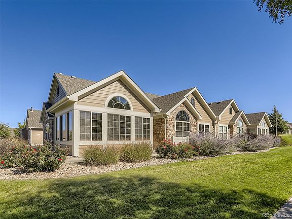 Maintenance Free immaculate patio home in the highly sough after Villas At Great Plains with over 1800 sq ft finished. All main floor living, no stairs and very open floorplan. 2 bedrooms, plus an office with double solid french doors and and extra bonus room with double glass french doors. Separate dining room, kitchen with eat in breakfast bar and a plethora of cabinets. The kitchen opens up to a spacious family room with a cozy gas fireplace, tall ceilings and gorgeous rounded upper windows. Separate laundry room with utility sink, extra cabinets and a bonus walk in finished storage room. 2 coat closets, extra wide doorways, large primary bedroom and bathroom with walk in shower with glass doors and walk in closet. 2nd bathroom is full with shower/tub next to 2nd bedroom. This home has it all on a quiet street, front sitting patio, storm door and large 2 car garage with work bench and extra cabinets. Perfect location to walk to the clubhouse, pool and trail system. Enjoy the playground, sports fields and easy access to 470, DIA, Murphy Creek Golf Courts and shopping centers. Enjoy a short drive to Southlands Mall, Movie Theaters and restaurants. This home is ready for new buyer and can accommodate a quick close.