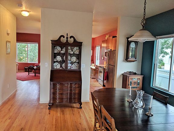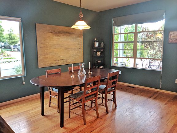 Immaculate and well cared for home by original owner in centrally located Spring Creek neighborhood. Two-story home with three bedrooms and 2 1/2 baths. Premium corner lot with mountain views and fully landscaped front and back yards. Mature trees, beautiful perennial beds and large patio area in back. Front porch faces open space with sunrise views and afternoon shade. Many upgrades and custom finishes. Hardwood floors throughout the main level. Built-in bookcase with cabinets for storage. Kitchen nook with built-in window seat and cushions included. Large formal dining room and cozy living room with fireplace. Full unfinished basement with laundry offers plenty of room to expand. Detached oversized two car garage behind the house.