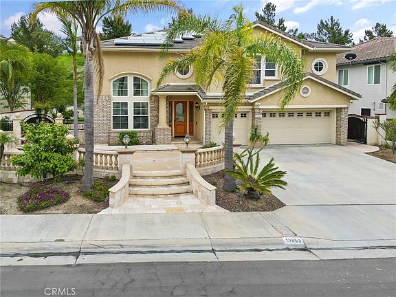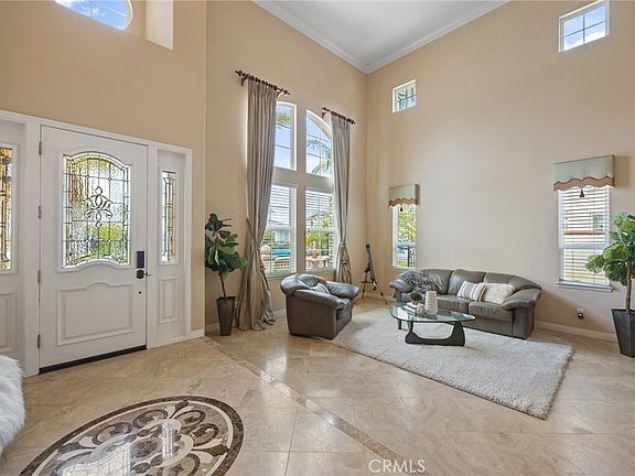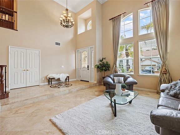 Located in the highly sought after Pointe East Lake community of Yorba Linda awaits your new home. This elegant 4 bedroom, 3.5 bathroom home is a spacious 3,938 sq. ft property, nestled in at the end of a cul-de-sac that showcases panoramic views that stretch as far as Catalina Island. A professionally hardscape front welcomes you with mature palm trees, enchanting fountain, and ample patio space to sit and enjoy the sunset. Upon entering you'll be greeted by the formal entry way with decorative inlayed stone floors. The formal living room boasts a two story ceiling and Palladian windows that let the natural light soak into the space. Just off of the formal living room is the formal dinning with it's stunning tray ceiling and entrance to the kitchen.