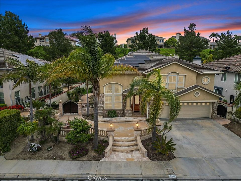 The chef inspired kitchen is a dream come true with granite countertops, cherry cabinets, center island with bar sink, 6 burner stove, and dual oven it is perfect for hosting dinner parties or the aspiring chef. The open concept flows into a dinning nook and family room with fireplace and built in shelving with plenty of storage. Down the hallway off of the entrance is a main floor bedroom with an en-suite 3/4 bath, an additional half bath, as well as a separate laundry room with entrance to the roomy 3 car garage. Make your way up the Mediterranean style staircase to find the primary suite, it's a luxurious space featuring a deep walk-in closet, quaint sitting area and a spa like bathroom with dual granite countertops, separate walk in shower and jetted soaking tub. Also located upstairs are 2 spacious bedrooms, a full bathroom, as well as a grand bonus room complete with fireplace, two built in desks and shelving as well as a stunning city view. This exquisite home is a marvel of modern technology, designed with the environment in mind. Powered by the sun, it features a cutting-edge Tesla solar energy system combined with Tesla backup batteries, providing an unrivaled level of energy independence and efficiency. Outside you will find an entertainer's backyard with built in BBQ, peaceful fountain, and fruit trees. Living in East Lake Village Community you will get the best of amenities such as a main, two-level clubhouse, 3 pools, spa, basketball courts, horse trails, tennis & sand volleyball courts, fitness facilities, trails, and so much more! Let's not forget you are just minutes away from award winning schools, shopping, dining, and recreational actives. Come see what gracious living is all about!