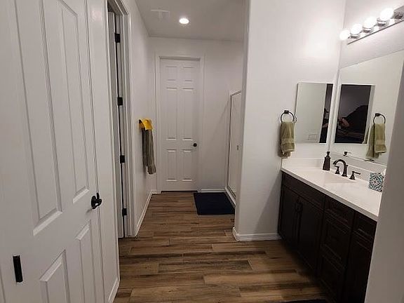 Your chance to own a ''lightly lived in'' new home! Owner works out of state and only lived in the home on weekends. MOUNTAIN VIEWS!! Tons of builder upgrades including wood look tile plank flooring, upgraded cabinets, sink, appliances and countertops, waterproof carpet padding (perfect for pets), ceiling fans in every room, prewired for surround sound, exterior stone facade, no exterior steps, raised garage door entry and too many electrical upgrades to list! Come see this beautiful home before it's gone!!