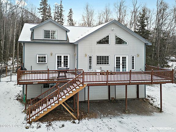 Truly Alaskan home nestled on a secluded street on over an acre of land with tons of flat space for toys. Mountain views from large windows throughout the home. Main living area and master suite features wood beams and high ceilings. One bedroom on the main level and two bedrooms up. Fully fenced yard, heat tape, new appliances, new toilets, new paint and lighting. This one won't last long!