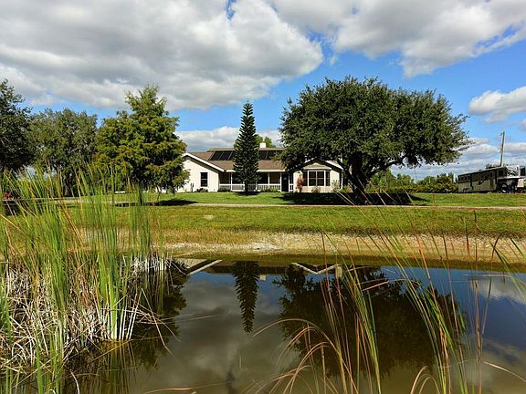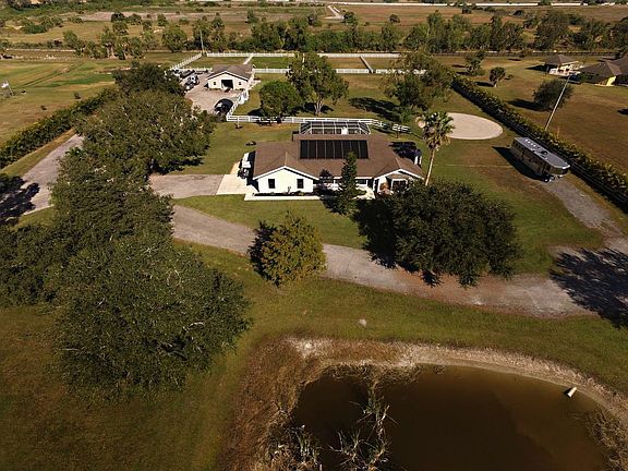 Beautiful, fully irrigated 5 acres, ready for your horses! 6 Stall Barn, plus tack and feed, stuccoed, with shutters, to match the house. Measuring 50x40, there are 6 industrial size fans, water, and electric. 6 zones irrigate the 5 paddocks, and 1 zone for the 60 ft., all weather footing lunging area. The house has 200 amp electric service, and separate meters for an RV/horse trailer, one for the horse treadmill (negotiable with sale of home),The kitchen is wide open, with brand new quartz counter tops, cabinets and newer appliances. There are 2 fireplaces, one in fam and one in liv room. The master bath is tastefully done in marble, with separate shower, and spa tub. A cabana bath and 2 sets of french doors lead to the screen patio and solar heated pool. The A/C is just one year new
