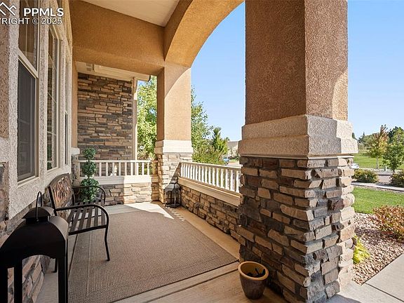 Unparalleled Views! Backing to open space and perched atop Flying Horse, this exceptional walk-out rancher offers one of the most breathtaking vantage points in all of Flying Horse. From Pikes Peak and Garden of the Gods to the the Air Force Academy and beyond, every glance reveals a Colorado masterpiece. The exterior is a blend of stucco and stone, crowned with a tile roof, all set on a private third-acre lot backing to an expansive greenbelt. Step inside and you are greeted by extensive cherry hardwood floors, 10-foot ceilings, and an open-concept design that frames the mountains. The gourmet kitchen is anchored by a six-seat island. Designed for entertaining, it seamlessly flows into the breakfast nook, formal dining room, and great room. A four-season covered deck is enclosed by a custom glass wall with electric solar shades, this elevated retreat offers year-round comfort without compromising the endless views, while an adjoining open-air deck is perfect for quiet mornings. The great room offers warmth with its stone fireplace and hardwood floors, while the master retreat is a sanctuary complete with a sitting area and stunning vistas. A versatile main-level guest suite or office and a full guest bath complete the main floor. The lower level walk-out is equally impressive with 9-foot ceilings, a spacious family and recreation room with wet bar, three additional bedrooms, and a full guest bath. Step outside to a 32-foot covered patio with hot tub, perfectly positioned for relaxation. This home provides easy access to I-25 and Denver while being just moments away from the prestigious Club at Flying Horse.