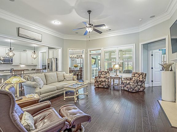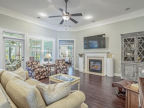 Enjoy incredible elegance at 1987 Windrose Way located in the active coastal lifestyle community of Cresswind in The Market Common. Immaculate 4 BR/ 3.5 BA Hickory Floor Plan on a lush premium lake-front lot is sure to impress. From the moment you step inside, you'll admire the welcoming entry with beautiful decorative grass wallpaper, gleaming hardwood floors, double crown moldings in the open living area with gas fireplace, lots of natural light and Plantation Shutters throughout the first level. The Gourmet Kitchen is outstanding and features a Double Oven, SS appliances, lots of cabinetry with bottom pull outs, gorgeous granite countertops with an expansive island that allows space for bar stools. Have your very own Butlers Pantry with additional cabinetry and a double door pantry for all of your storage needs. A spacious kitchen nook is great for casual dining or opt for the beautiful Formal Dining Room with wainscoting- entertainment options are endless. The vented Four Seasons Room flows just off the living area and offers serene views any time of year with sliding glass windows, ceiling fan, and luxury plank flooring. Step out onto the covered brick paver patio to enjoy the outside gas grilling area featuring a stacked stone surround and Corian countertop. There's lots of space for dining and wining while enjoying the appeal of lush views and the ponds' fountain aesthetics. The Owner's Suite is fit for royalty with it's sizable dimensions of 18'4x14'0, trey ceiling with fan and double door entry into the spa-like ensuite. The turned tile flooring is lovely in this grand bath, and the granite topped double vanity is graced with many drawers and cabinetry for storage and includes a makeup table in the center. There's a linen closet, garden tub, and separate glass enclosued tiled shower with built in seat, but the enormous walk in custom wardrobe may be the cherry on top. Two other good sized bedrooms at the front of the home share a large Jack and Jill bath with shower/tub combo and there's a convenient powder room just off the main living area. The laundry room offers new LG full sized washer & dryer and cabinetry for storage of supplies. A custom Barndoor accesses the entry to stairs for the 4th Bedroom or Bonus Room with a spacious closet, full bath, and entry into the floored attic area. An oversized 2 Car garage with epoxy flooring has unlimited storage space, utility sink, pull down stairs to additional storage, and side walkout. On top of this fantastic home, there is little to no yard maintenance since the HOA fees cover the lawn care. Cresswind has spectacular amenities with a resort-like Club House, a large fitness center, expansive pool, a hot tub, tennis courts and scheduled events. The HOA also includes cable/internet, lawn care including mowing & irrigation. Market Common has everything you need with dining, shopping, a movie theater, grocery stores, medical center, walking trails, parks & a large dog park with so much more! Located just minutes from the Atlantic beach and Myrtle Beach State Park! Don't miss out on this beautiful home. Schedule your showing today! *Open House from 12-2 on Sun Aug 14th * Seller is a licensed Realtor*