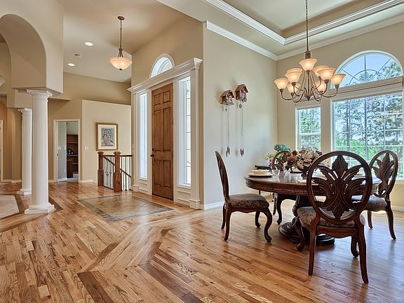 Beautiful stone and stucco custom home with views of Elephant Rock and the Front Range. Two Colorado blue spruce trees are the focal point in the front along with the extensive rock walls and the convenience of a circle drive with side entrance to the 3 car garage. Grand entry with tile & Oak hardwood floors leading through columns and arches into great room that includes a gas fireplace with custom Alder mantel, built-in shelves and walk-out to patio. Open gourmet kitchen has slab granite, Alder cabinets, stainless steel appliances, double wall oven, gas cooktop and eating nook with walk-out. Laundry area off kitchen includes walk-in pantry, cabinets and tile floors. Spacious master includes upper windows with views, walk-in closet, crown molding, private spa with beautiful custom tile plus slab granite. Main level features; office with tray ceiling and crown molding, full bath and one additional bedroom. Lower level includes; huge family room, game area with wet bar that includes a huge wine room, granite and full size refrigerator, separate gathering area including a walk-out to front patio, additional 3 bedrooms, one en suite, additional full bath, tons of storage closets and mechanical room with two water heaters and built-in shelving for future aquarium. Just beautiful!