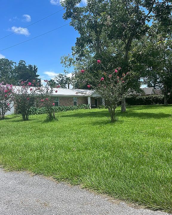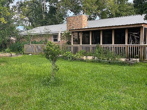 3/2 brick w/metal roof Large corner lot .70 +\- acres Not a through street, very private Attached garage w/custom shelves Auto garage door Granite in Kit and both baths Stainless dish/stove /fridge Ceiling fans and vintage lights Cordless Push Blinds throughout Wood burning fireplace. Maint in last year 3rd BR was used for office with custom shelves installed. Gray wood grain lam flooring throughout. 11’ x 17’6” screened patio w/ceiling fan 11’8” x 21’9” deck Privacy fenced w/4’ and 16’ gates Rose bush covered pergola Waterfall and ornamental pond Orange, pear and lemon fruit trees Pecan trees 25x25 Concrete slab for future shed Master 15’5” x 11’6” BR 2 13’5” x 12’5” BR 3 11’5” x 11’ DR/sitting. 11’5” x 22’5” Kit/Den. 13’5” x 25’9” Her Master Closet 5’3” x 15’7” w/custom shoe rack Mud room w/Pantry 8’x8’ odd
