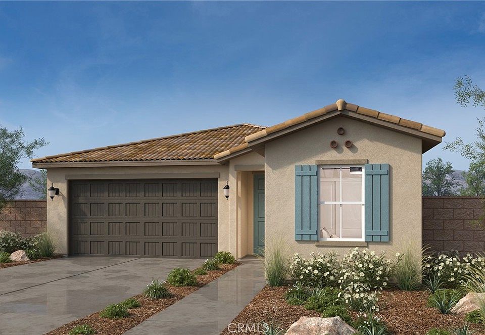 This beautiful and efficient 1,279 sq/ft single-story floor plan is in the popular Orangecrest neighborhood of Riverside and makes the perfect starter home or down-sizing retreat. All Argento @ Citrine homes are single story and offer soaring 9-ft ceilings and large windows to let in lots of natural light. This home is enhanced with a south-facing location on a cul-de-sac street and across the street from one of the beautiful Citrine community parks. This floor plan boasts a kitchen/great room combo that gives you room for entertainment and family fun. This home also includes luxury vinyl plank flooring in common areas and complemented by soft low-pile carpet in bedrooms and closets. The stylish kitchen features an island, Shaker-style cabinets, quartz countertops and coordinating tile backsplash, and Whirlpool® stainless steel electric range, microwave, and dishwasher, undermounted sink with Moen faucet, and a pantry. The great room opens to the deep and private back yard perfect for family gathering and outdoor activities. There are 3 bedrooms and 2 full bathrooms, both with Shaker-style vanities that match the kitchen cabinets. The primary bathroom offers a bathroom door, large shower, dual-sink vanity, and a walk-in closet. This home sits on an estimated 5,932 sq/ft lot with driveway and two-car garage. Our community parks will offer outdoor family fun with playground equipment, dog parks, and open spaces! Great schools are nearby as well! Photo is a rendering of the model. Buyer can either lease or purchase the Solar.