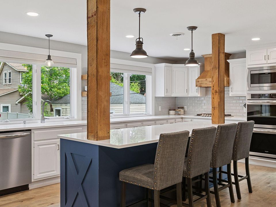 Nestled in the highly sought-after Merriam Park neighborhood, this stunning home is located just blocks from parks, restaurants, cafes, and the Mississippi River! This gorgeous 2 story boasts 4 bedrooms, 3 bathrooms & an oversized 2 car garage. You will love entertaining in this bright & open floor plan with natural light pouring in through large windows that overlook the huge backyard. The 9 ft kitchen island is a showstopper with quartz countertops and so much incredible storage. The kitchen features stainless steel appliances, double ovens, two pantries, and custom barnwood details throughout. The mudroom offers excellent organization. Your private primary bedroom awaits, with a walk-in closet and private sunroom (perfect for morning coffee or an additional office space)! Enjoy the stunningly remodeled bathroom with double sinks, gorgeous tile insets in the shower, and a built-in linen cabinet. If that's not enough, the oversized .17 acres and large deck offer the perfect space for outdoor entertaining and relaxing! You will love the spacious garage with an additional concrete parking slab next to it and the opportunity to finish off the framed out space above the garage! It would be perfect for an office, guest bedroom or hangout space! Imagine movie nights next to your cozy gas fireplace and evening BBQ's in your beautiful backyard.