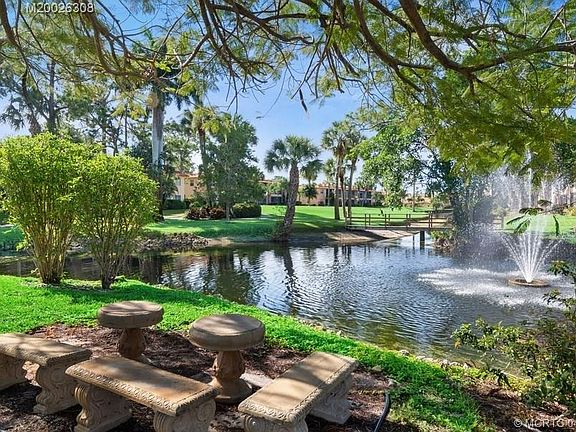 Second floor 2 bedroom, 2 bathroom corner/end unit with GORGEOUS TILE FLOORS, and FABULOUS view of the pond and fountain from a glassed in porch. UNLIMITED GOLF in this super active 55+community! Just steps from the first hole, clubhouse and heated community POOL! Also, there is a River Clubhouse with a kayak launch and 2 fishing docks. The HOA pays for all the golf, pool, fitness center, library, workshop, shuffleboard, billiards and bocce, canoe & kayak launch, basic cable and more. Come live the Florida lifestyle and GOLF 'till your heart's content! Close to Downtown Stuart shops & restaurants, beaches.