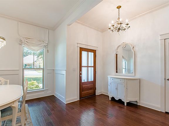 Stunning Truland built home tucked away at the end of a quiet loop. Walk onto this gorgeous property to find privacy, beautiful landscaping, and endless custom finishes. Soaring ceilings, cased out windows, crown molding, wainscotting, hardwood flooring, gas fireplace and antique chandeliers are among the many touches you will find upon entering. The kitchen features stainless steel appliances, custom backsplash & ceiling-height cabinets, granite countertops, gas stove and an extensive bar area for added seating. Mudroom with builtin storage sits just off separate laundry room. Split bedroom plan with gorgeous master bedroom and bath. Master features tray ceiling, extra seating area, his and her closets and large bathroom with garden tub. All bedrooms feature crown molding and walkin closets. Overlooking a wooded lot, a newly extended back patio lends ample room for entertaining or just enjoying the serene fenced backyard. In addition to custom finishes, this home is equipped with rain gutters, a sprinkler system, builtin garage tool bench and has Gold Fortified certification. With this property, you have all the benefits of a new home with the bonus of extra additions per seller!