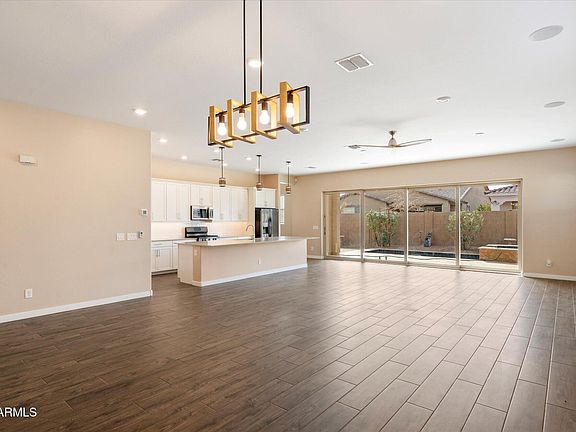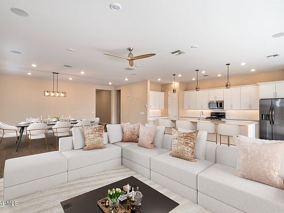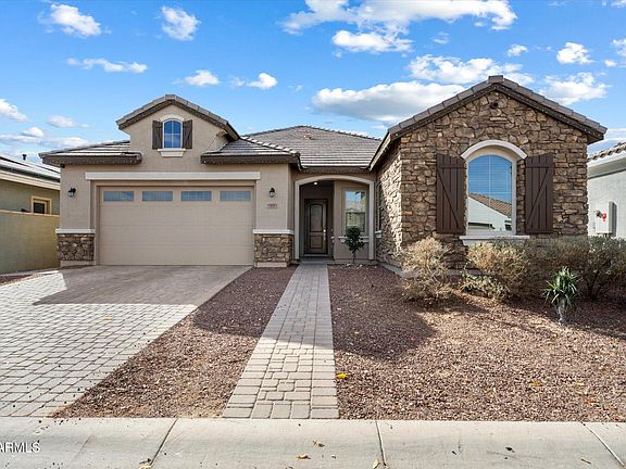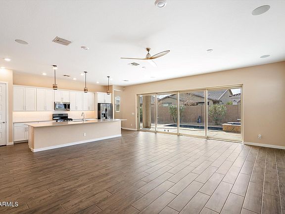 Welcome to the highly desired Verrado neighborhood! Stepping inside, you'll be greeted by an open floor plan seamlessly connecting the dining, living, and kitchen areas, with a pleasant outlook onto the backyard. The kitchen is a chef's dream, boasting stainless steel appliances, 42'' white shaker cabinets, quartz countertops, and a large island. The master suite is a true retreat, featuring a bath with an extended shower, dual sinks, and dual closets. Three additional bedrooms and two baths, plus a teen room, provide plenty of space for family and guests. The 3-car garage has been thoughtfully converted into a flex room, but can easily be returned to its original purpose. Outside, the backyard is an entertainer's paradise, complete with a large patio, a pebble-tec pool and spa..... surrounded by travertine tile, all with smart control features. A secondary paved area offers additional seating. This home is conveniently located close to schools, dining, and freeways.