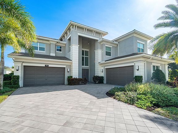 Welcome to 19894 Meadowside Lane, an exceptional residence located on an oversized corner lot in the prestigious gated community of Berkeley in Boca Raton. This luxurious Riverside model built by GL Homes in 2020 offers 5,752 sq ft of elegant living space, including 5 bedrooms, a media room, a loft, 5.1 baths, and a 4-car garage (2 separate 2-car garages). With its impeccable craftsmanship and thoughtful design, this home is a masterpiece of contemporary living. The grand entryway flows seamlessly into spacious, light-filled living areas. The gourmet kitchen is a chef's dream, featuring custom cabinetry, quartz countertops, a center island with bar seating, top-of-the-line appliances (gas cooktop), and a breakfast nook, all open to the Great Room, perfect for entertaining. Entertain in style in the formal dining room, or unwind in the first-floor en-suite bedroom or media/club room, which can be easily converted into a 6th bedroom, home theater, or extended living area or family room.